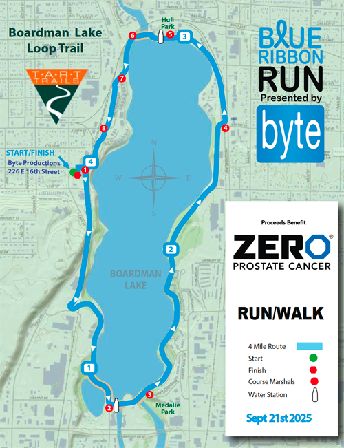 AGAIN FOR 2025: the start and finish will be at Right Brain Brewery/Byte Productions and the course will take you around the Boardman Lake loop. This will be the 3rd year our event will utilize the new TART Boardman Trail loop!